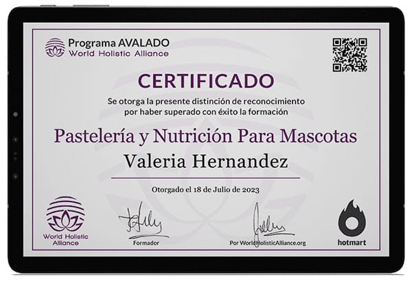 Podrás avalar los conocimientos adquiridos en nuestro programa “Pastelería nutricional para tu Mascota” con un certificado de finalización.